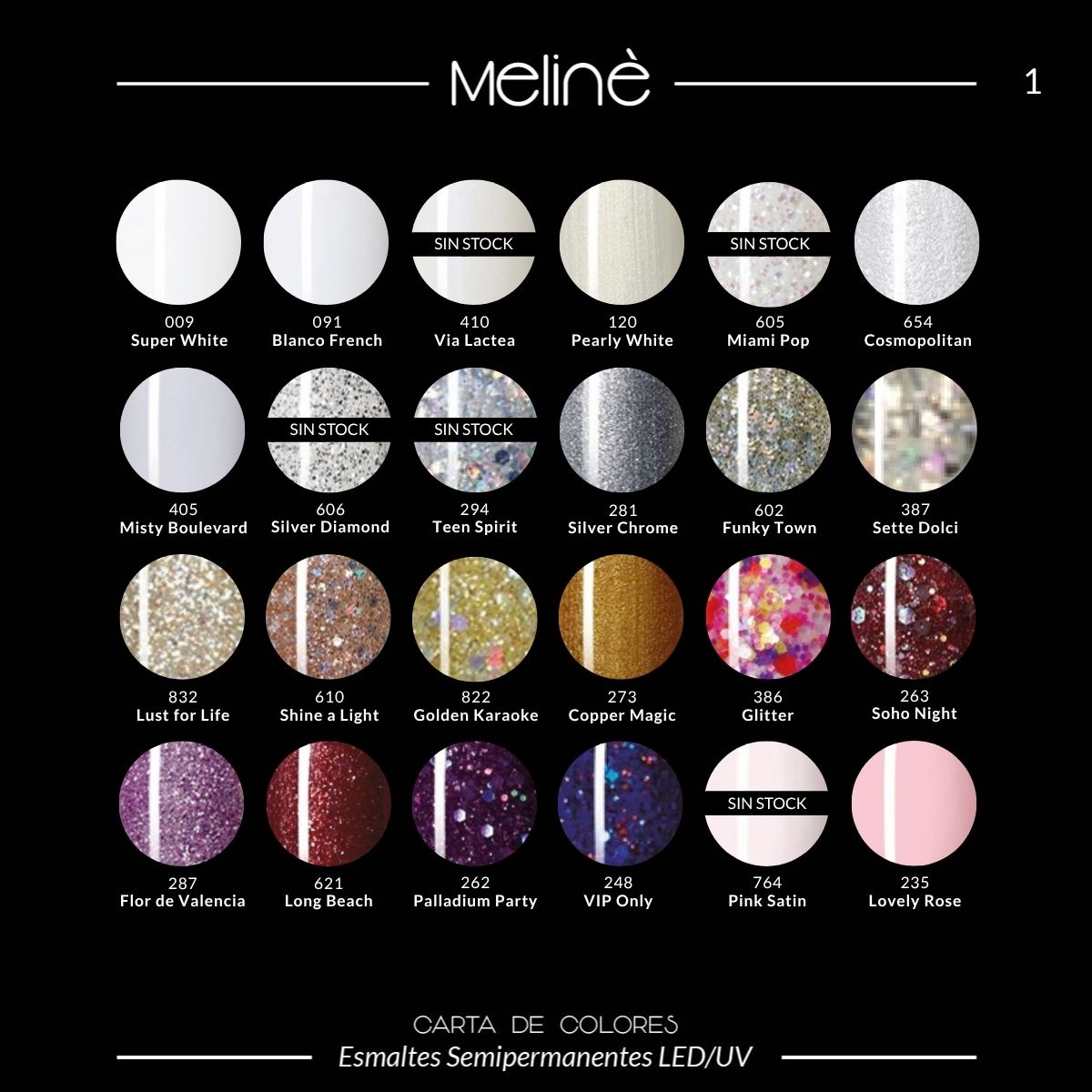 9 - Aplicar una capa de Top Coat Meliné con el mismo sistema. El Top Coat U.V. Brillo sellará el color y aportará un brillo duradero. Secar en la Cabina U.V. durante dos minutos o Cabina Led durante 30 a 60 Seg.