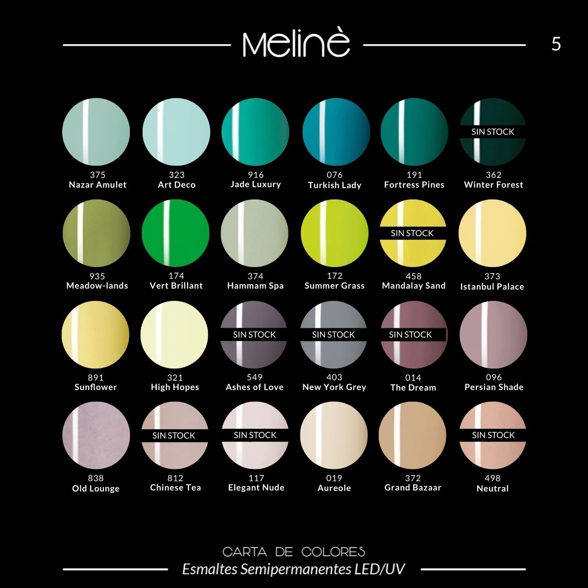 Esmalte Color Semipermanente Gel para cabinas LED/UV. El esmalte Meliné posee más de 20 variaciones de color y un impresionante poder cubritivo.