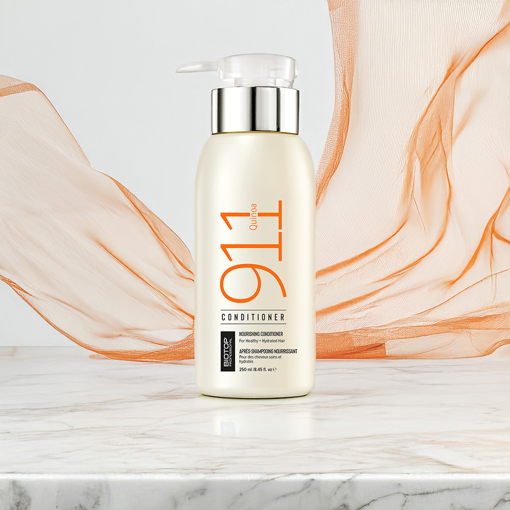 911 Quinoa Acondicionador hidrata en profundidad y aporta hidratación y nutrientes a los cabellos secos, castigados u opacos. Esta fórmula, que equilibra el pH, está enriquecida con proteínas de quinoa para alisar y acondicionar el cabello, y a la vez restaurar los aminoácidos y proteínas esenciales, dejando el cabello sano, brillante y más manejable.