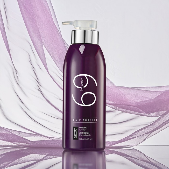 La crema para peinar sin enjuague 69 Pro-Active Hair Soufflé de BIOTOP PROFESSIONAL realza los rizos, promoviendo su forma y elasticidad natural sin apelmazar el cabello ni dejarlo pegajoso.