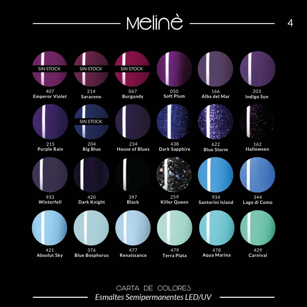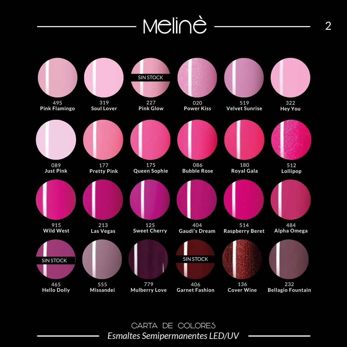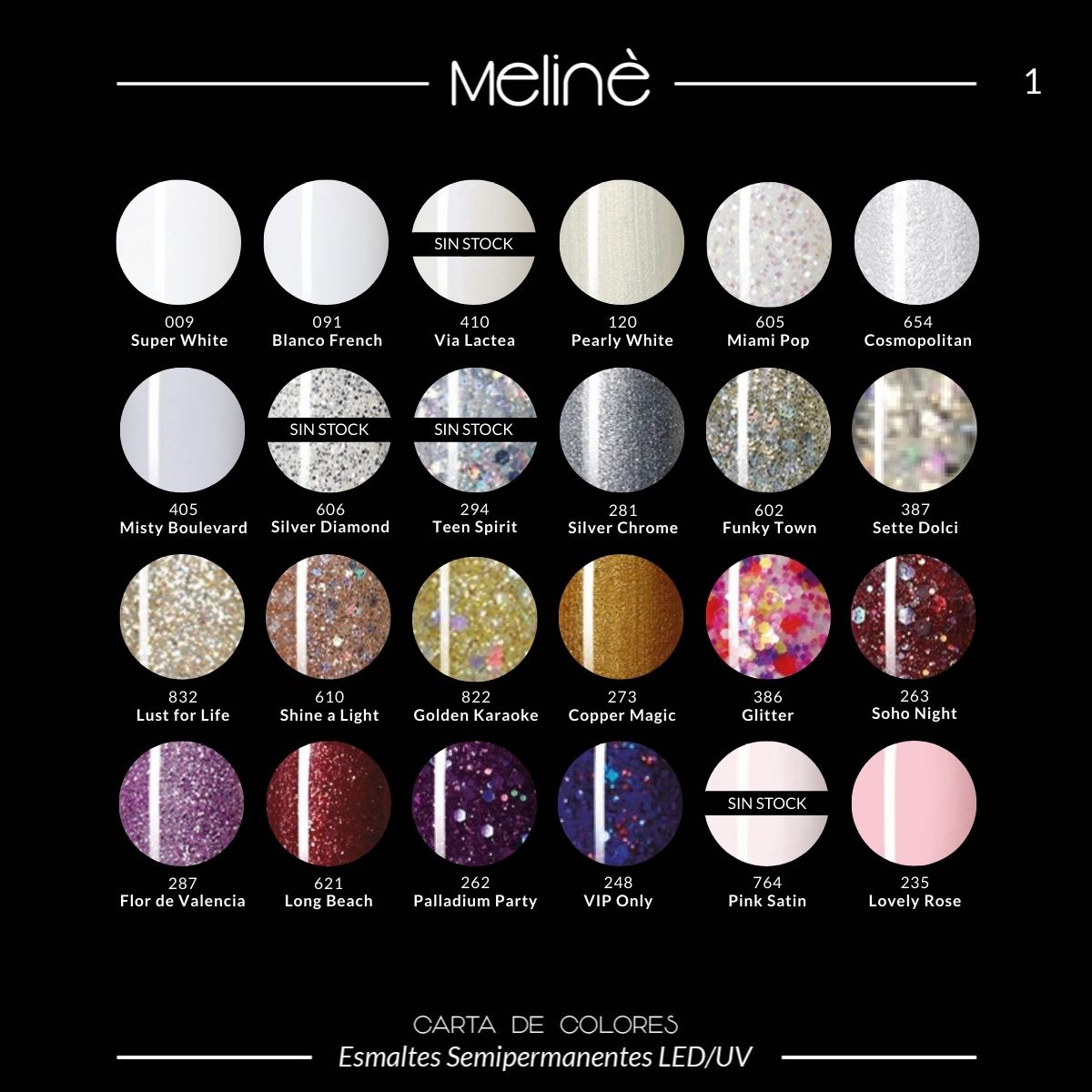 Esmalte Color Semipermanente Gel para cabinas LED/UV. El esmalte Meliné posee más de 20 variaciones de color y un impresionante poder cubritivo.