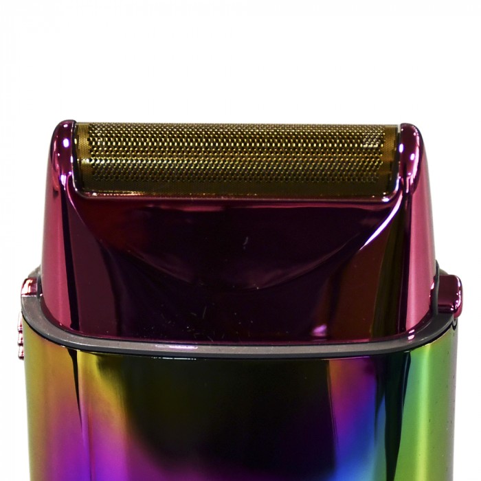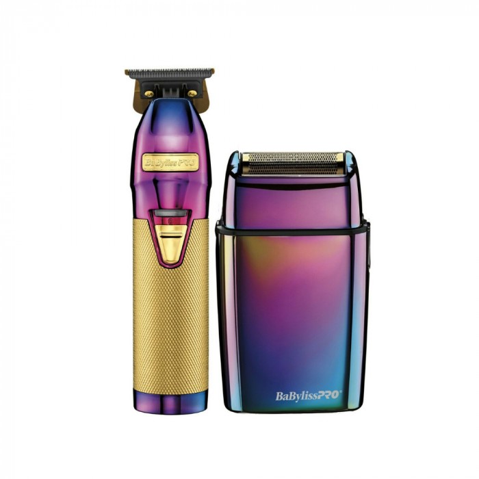 Incluye la recortadora para contornos con batería de litio y cuchilla color iridiscente en forma T de dientes profundos Chameleon FX y nuestra afeitadora metálica de hoja simple sin cable Chameleon FX