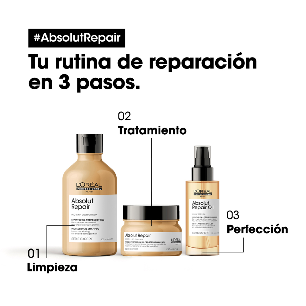 La máscara Absolut Repair ofrece la última experiencia de la reparación profunda profesional para el cabello dañado y seco. Los resultados se demuestran: recupera visiblemente el cabello dañado que resulta en 77% * menos daños en la superficie de la fibra. El pelo es manejable y más brillante después de la rutina de tratamiento, incluyendo el shampoo Absolut Repair. La fibra se fortalece y es restaurada gracias a los potentes ingredientes de quinua y proteínas. Esta máscara de lujo tiene una textura sedosa, que envuelve el cabello dañado con cuidado sin dejar ningún residuo. Para un resultado óptimo de reparación contra el daño, utilizar toda la rutina Absolut Repair. * Shampoo + Máscara Absolut Repair