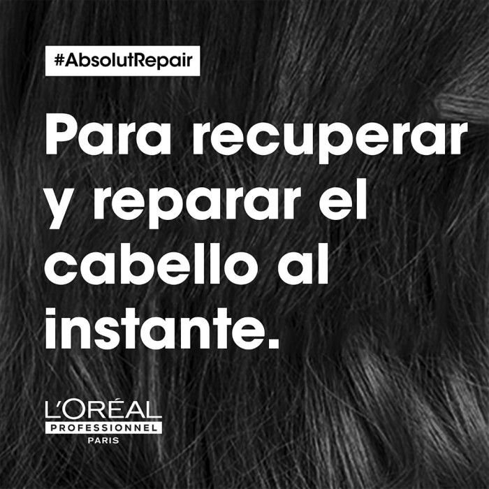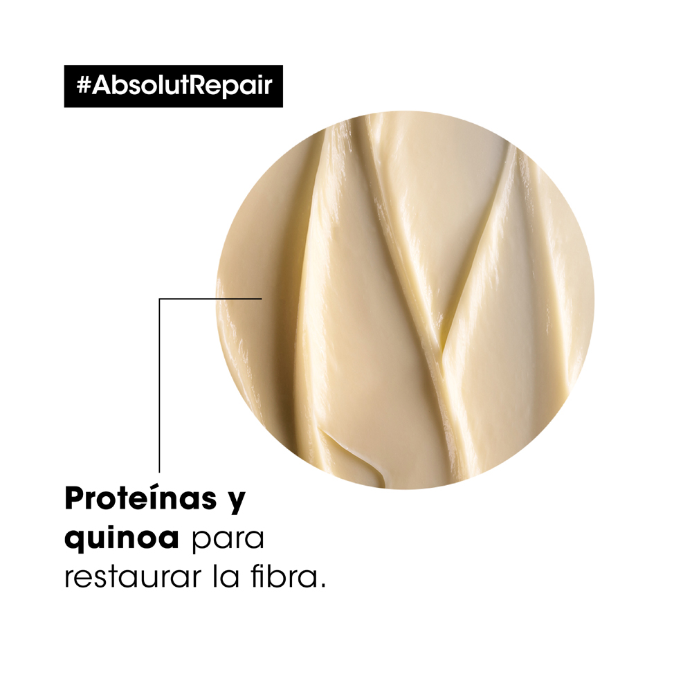 "El shampoo Absolut Repair ofrece la última experiencia profesional de reparación para el cabello dañado. Los resultados se demuestran: El shampoo recupera visiblemente el cabello dañado con un toque muy ligero y suave que resulta en 77% * menos daños en la superficie de la fibra . El pelo es mangeable y más brillante después de la rutina de tratamiento incluyendo la máscara Absolut Repair. La fibra se fortalece y restaura gracias a los potentes ingredientes de quinoa dorada y proteínas. Esta fórmula profesional es utilizada y aprobada por peluqueros y parte de su tratamiento en los salones de L'Oréal Paris Professionnel en todo el mundo.