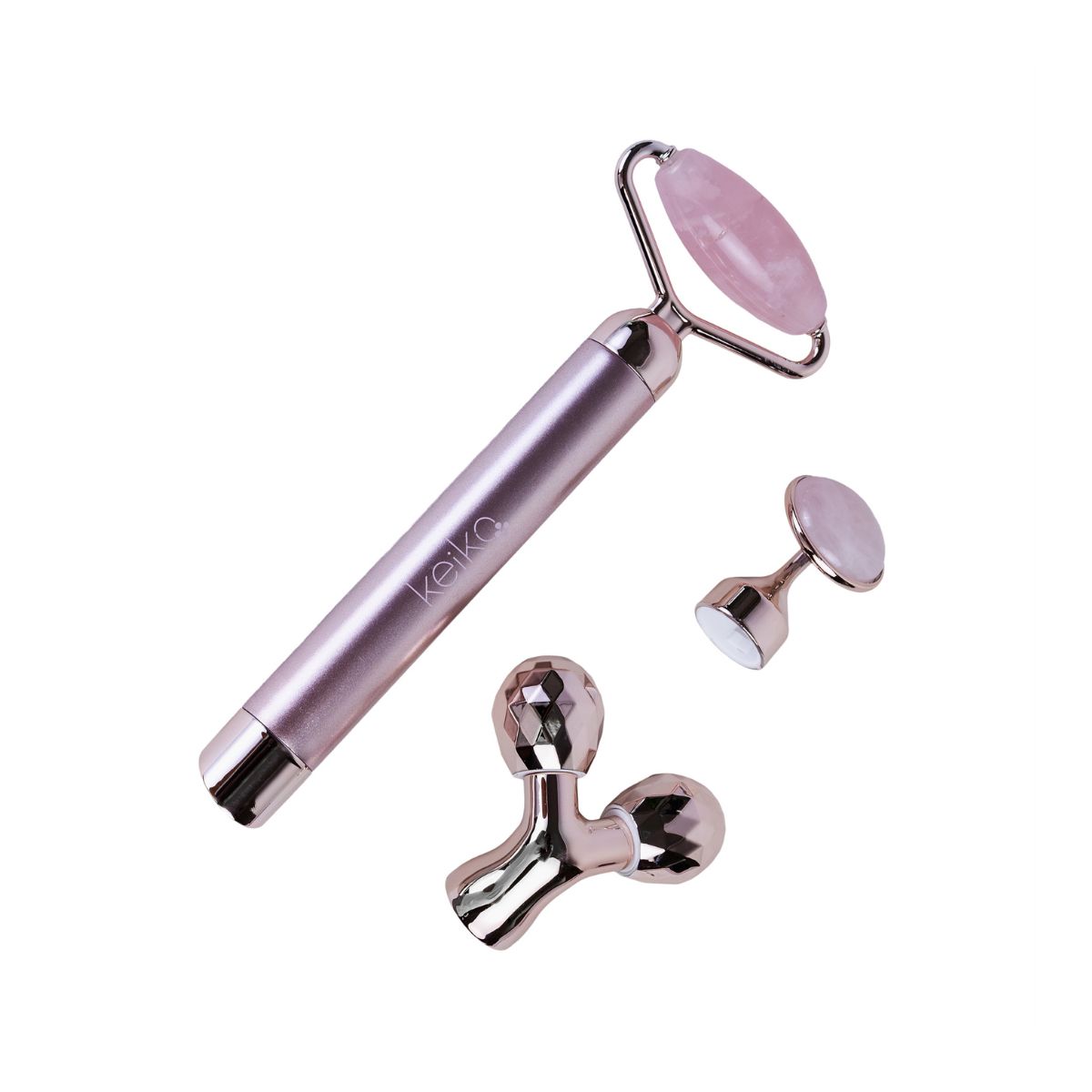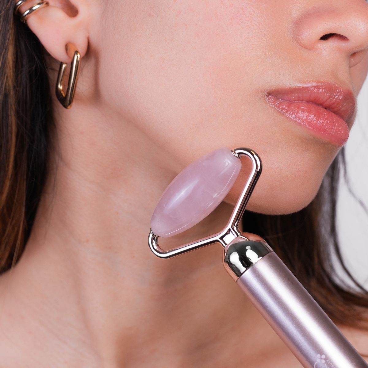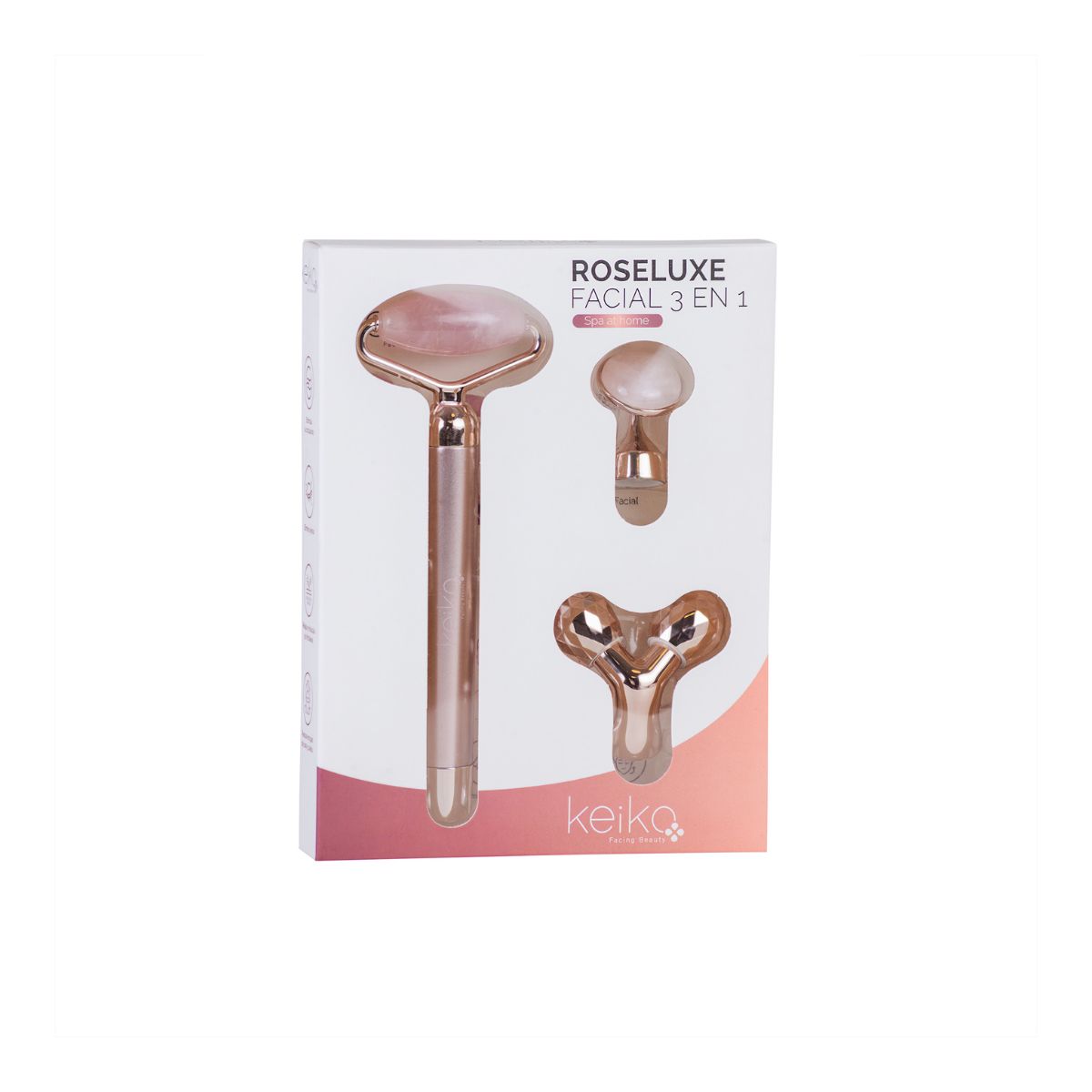 Set 3 en 1 de Jade Roller y Gua Sha con piedra de rosa Usa el masajeador facial eléctrico con productos para el cuidado de la piel para promover una mejor absorción. este rodillo facial de jade y la piedra gua sha están hechos de piedra de jade natural real 100% original y de primera calidad