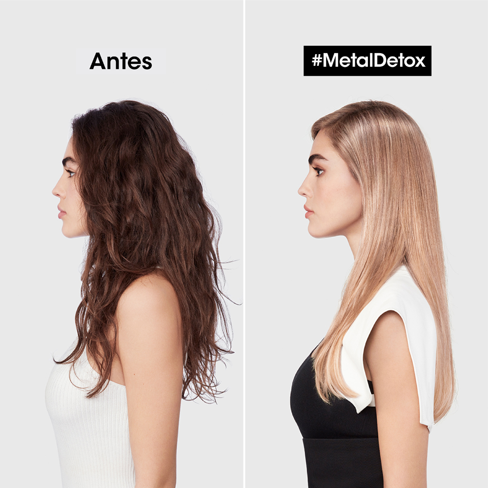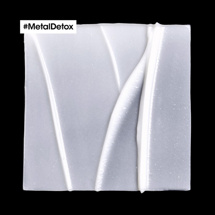• La máscara protectora anti-depósitos Metal Detox protege la fibra de los depósitos de partículas después de cualquier servicio de color, balayage o decoloración. Este baño de crema aporta cosmeticidad y evita la reaparición de nuevas partículas de metal en el cabello, provenientes del agua.